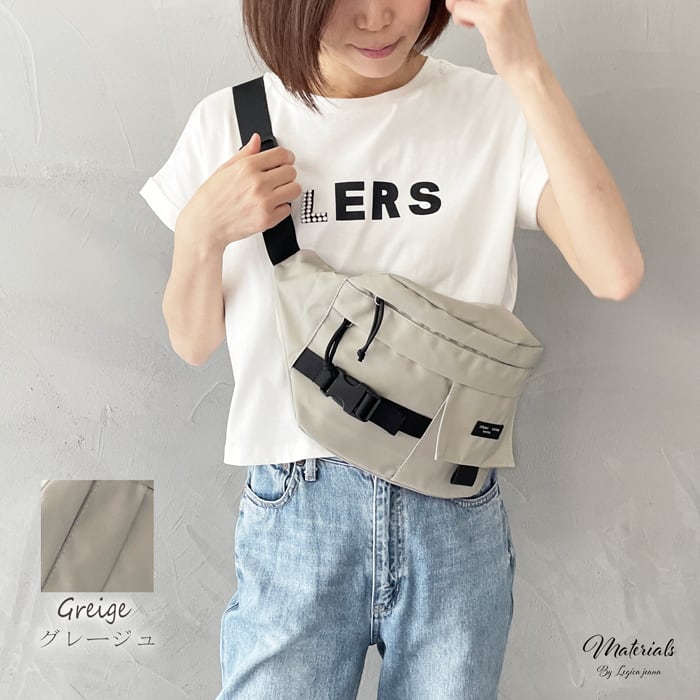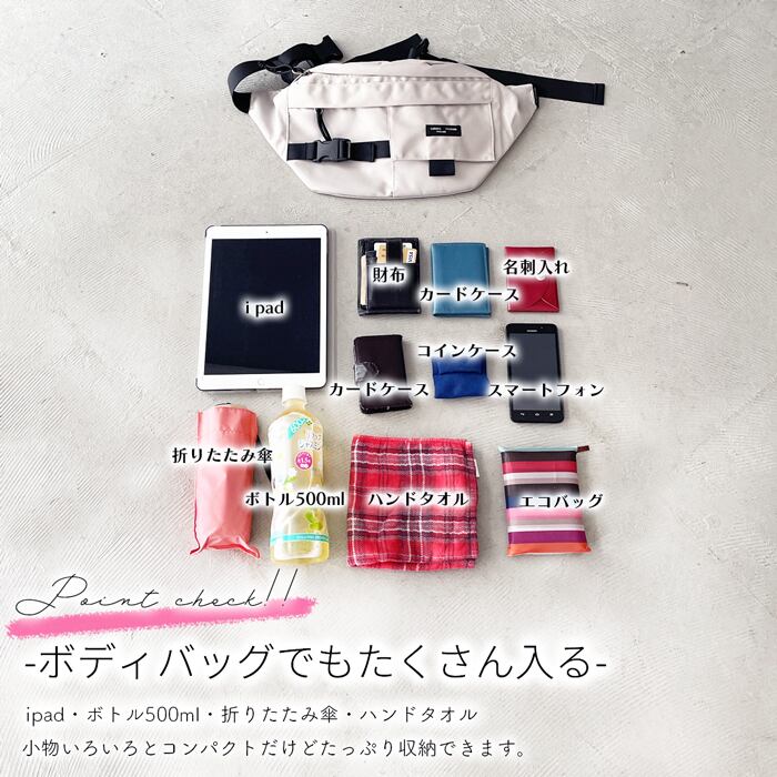 コンパクトに見えて、長財布やスマホ、ペットボトルまでしっかり入るボディバッグ。